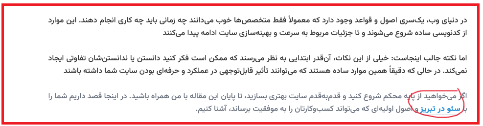 انکر تکست همان متن لینک است که کاربر روی آن کلیک میکند. این متن باید دقیقاً مرتبط با موضوع و کلمه کلیدی صفحه مقصد باشد. چرا؟ چون ۶۰ درصد لینکسازی داخلی به همین انکر تکستها وابسته است. اگر انکر تکست خوب انتخاب نشود، کاربر نمیفهمد لینک به کجا میبرد، و گوگل هم نمیتواند ارتباط صفحات را تشخیص دهد.